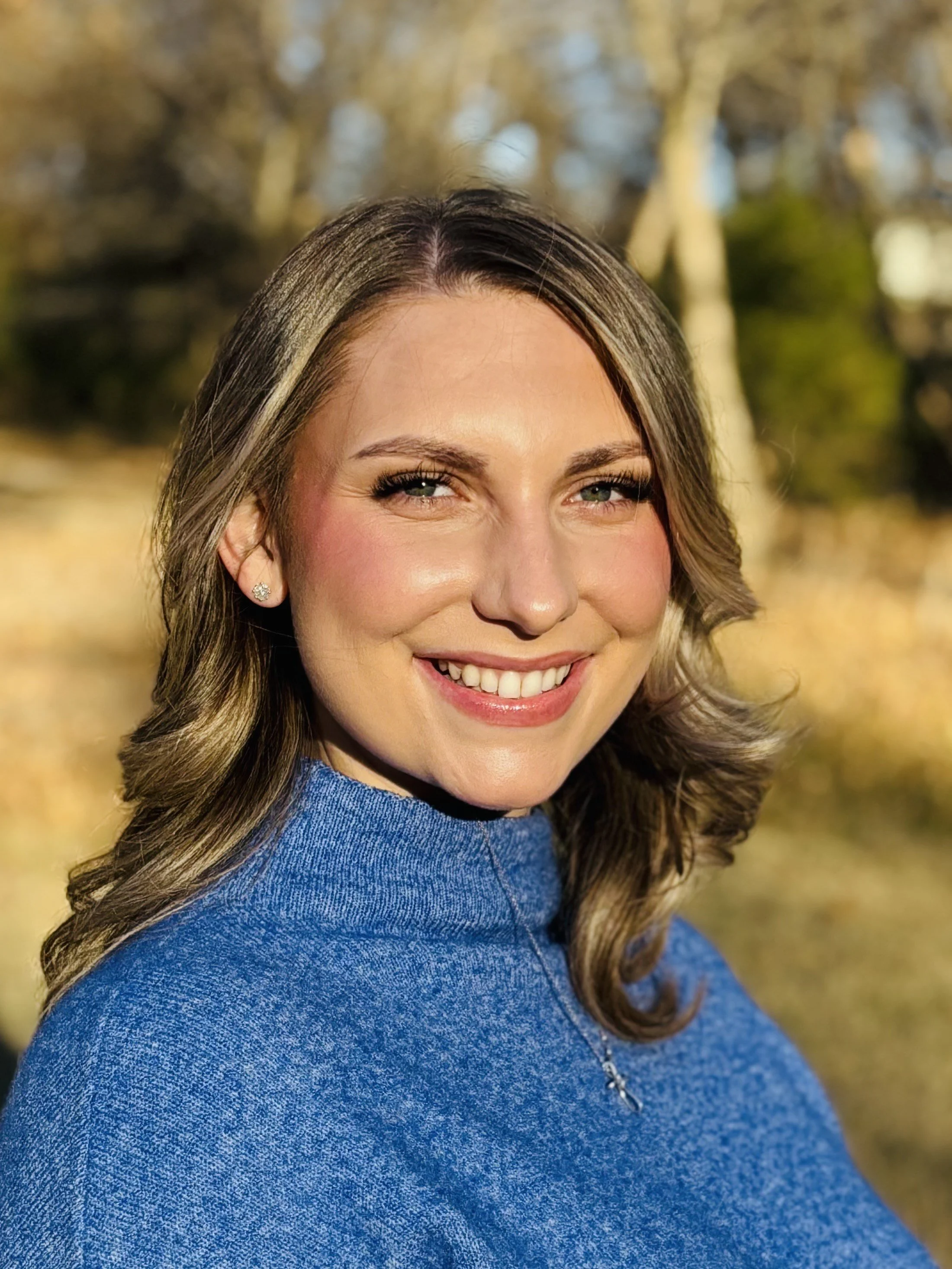 • A woman with long brown hair, blue eyes, and a bright smile stands outdoors. She is wearing a black top and a light-colored blazer, with a background of green trees and a cloudy sky.